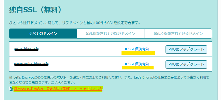 SSL化したいドメインの独自SSL(無料)を設定するをクリック